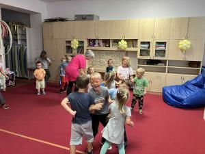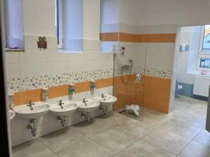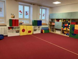 Místnost je využívána i ke cvičení. Děti mají k dispozici žíněnky, dřevěnou skluzavku, průlezky, tunel, žebřiny, skákací míče, švihadla a gymnastické kruhy. Zde si rovněž děti staví z velkých kostek, jezdí s auty, hrají taneční a pohybové hry. Zdravotně hygienická zařízení v umývárně a na toaletách jsou udržována v čistotě a odpovídají počtům dětí. Každé dítě má svoji poličku s hygienickými potřebami a ručníkem, děti si denně čistí zuby.