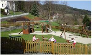 V těsné blízkosti je i školní zahrada, která je vybavena novými herními prvky, odpovídajícími normám EU. Děti mají k dispozici velkou dřevěnou tabuli na kreslení, vahadlovou houpačku, dvě závěsné a dvě pružinové houpačky,lezeckou stěnu s pohyblivým mostem a skluzavkou, kolotoč a velmi oblíbené a dětmi hojně využívané pískoviště se zásobou hraček. Okolí atrakcí je vysypáno drobnými oblázky, příjemnými na hraní i samotný doskok a dopad.Stromy poskytují nejen příjemný stín, ale i možnosti při pozorování a seznamování se s přírodou.