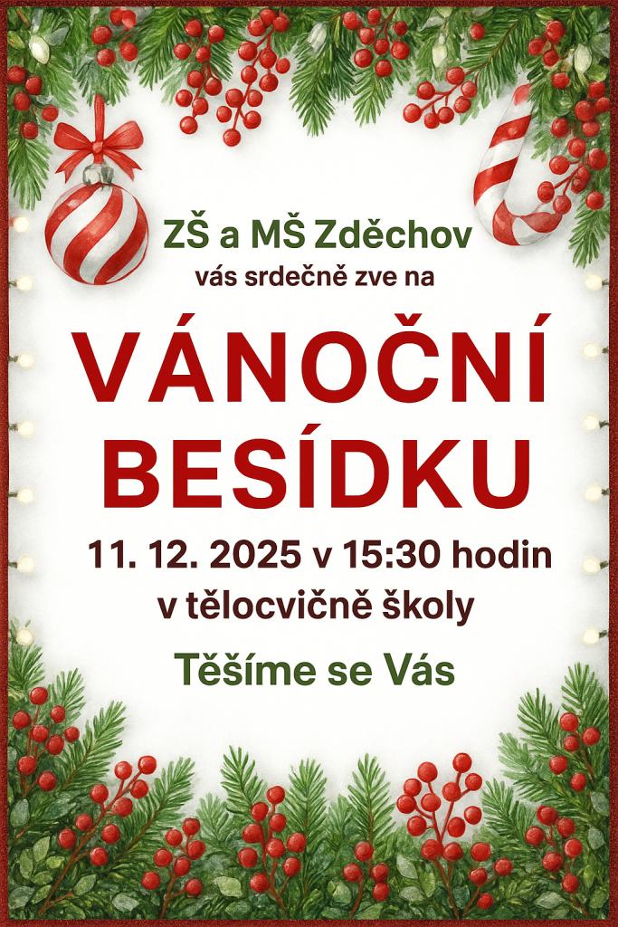 vanocni_besidka_plakat.pdf Typ: PDF dokument, Velikost: 3.94 MBZveme všechny rodiče a přátele školy na tradiční vánoční besídku, která se uskuteční v prostorách tělocvičny naší školy. Během akce si děti připravily bohatý program plný písniček, tanců a divadelního vystoupení. Přijďte si s námi užít společné chvíle a nasát vánoční atmosféru.