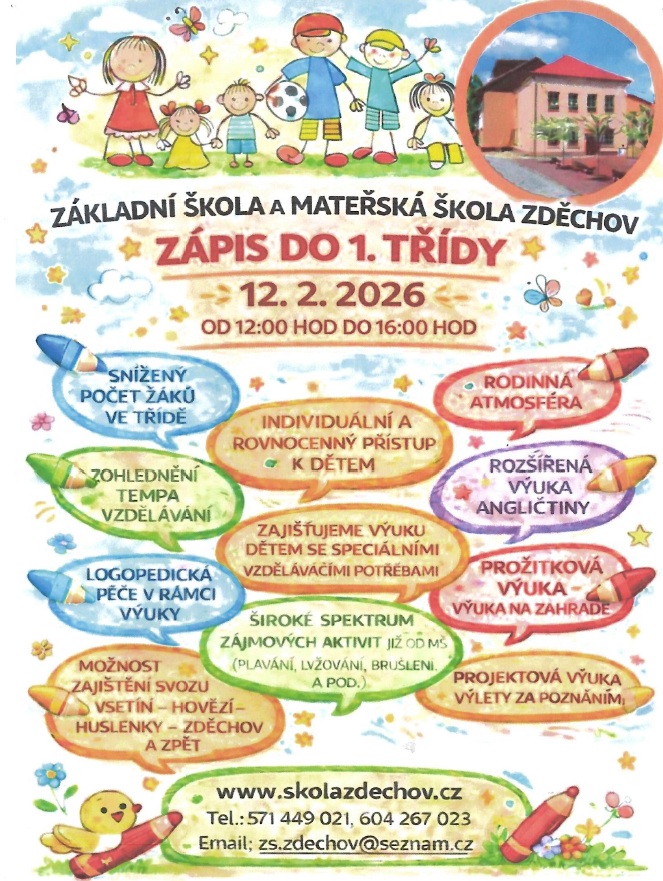 Základní škola a Mateřská škola Zděchov srdečně zve rodiče a jejich děti k zápisu do 1. ročníku.